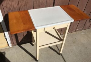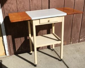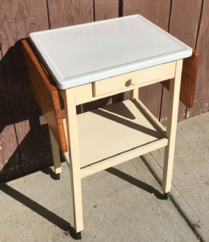 Vintage Enamel Top one-drawer stand/table on casters with wood drop- leavesThis is such a cute unique table or stand with drawer. It has a vintage white enamel top with 2 solid wood drop leaves and it is on wheels. $68.00